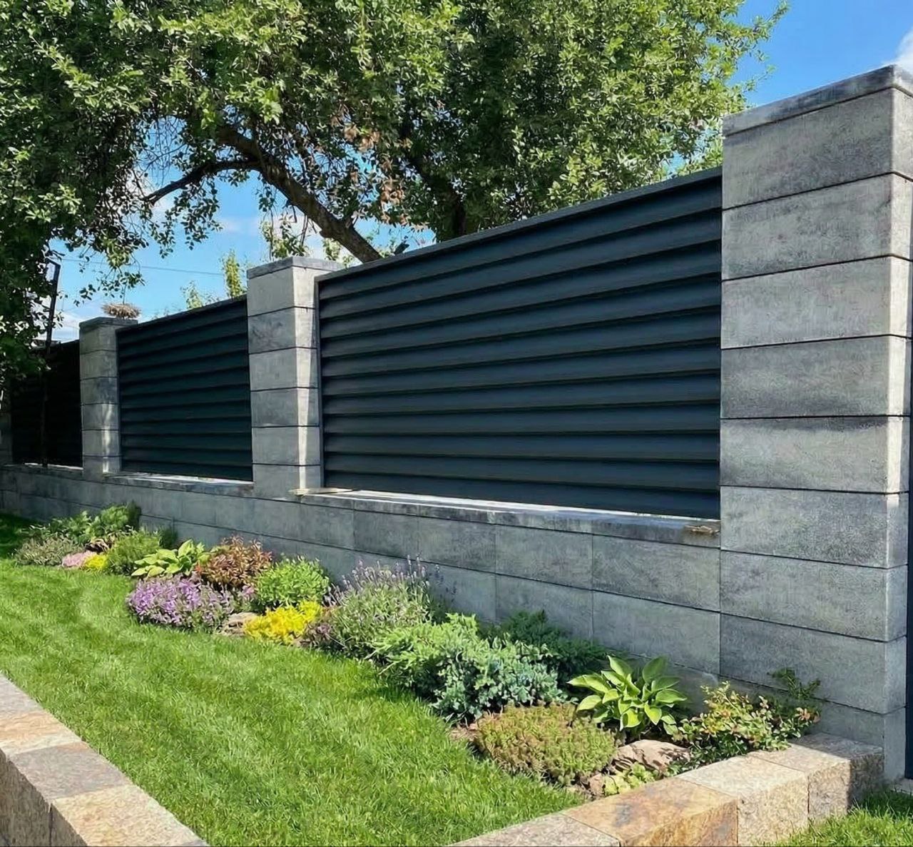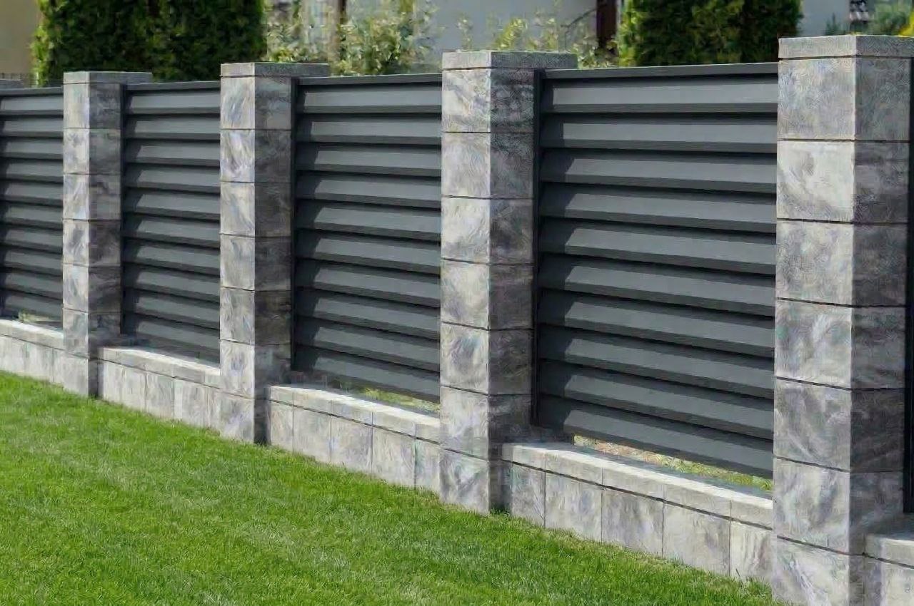 Сучасний паркан з декоративних блоків з армуванням та фундаментом. Стійкий до вологи, морозу та механічних пошкоджень. Підходить для огородження приватних ділянок, дач та котеджів. Можливе комбінування з іншими матеріалами таких як металеві жалюзі , горизонт , профнастил , габіон, термодерево .